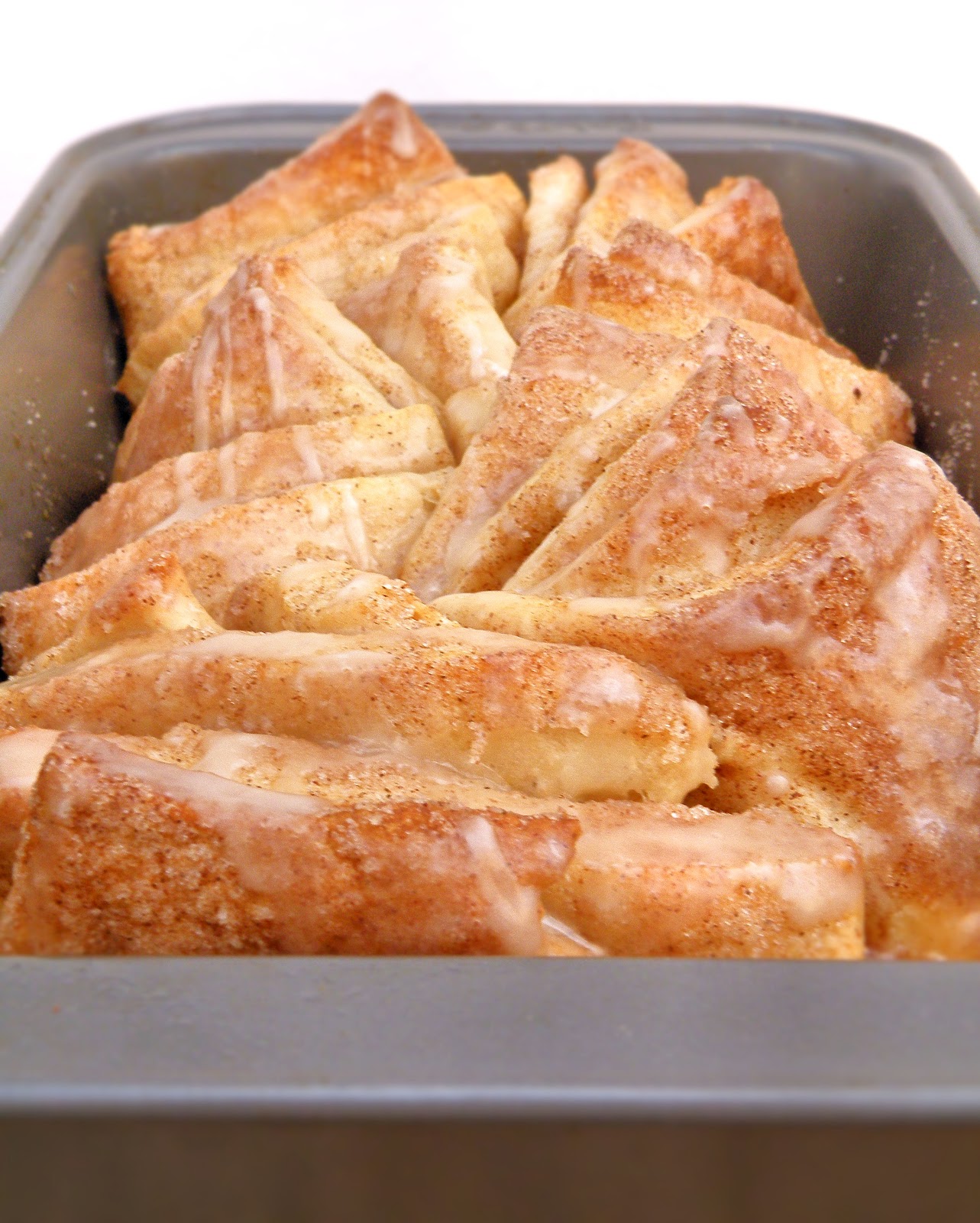 Bake loaf about 30 minutes or until golden brown. Place pan on wire rack to cool. (Here you can either let the loaf cool 10 minutes, and then take out of pan & place on serving plate to glaze. OR you can glaze it immediately, while it's still in the pan, for a more informal serving. I did the latter, and just pulled the pieces right out of the pan. Depends on your preference!) Make glaze: In a small bowl or measuring cup, stir together powdered sugar, vanilla, and enough milk to make a glaze of drizzling consistency. Pour glaze over top of loaf. I would recommend eating while it's still warm, but you can also let cool before serving. Makes 8-10 servings.